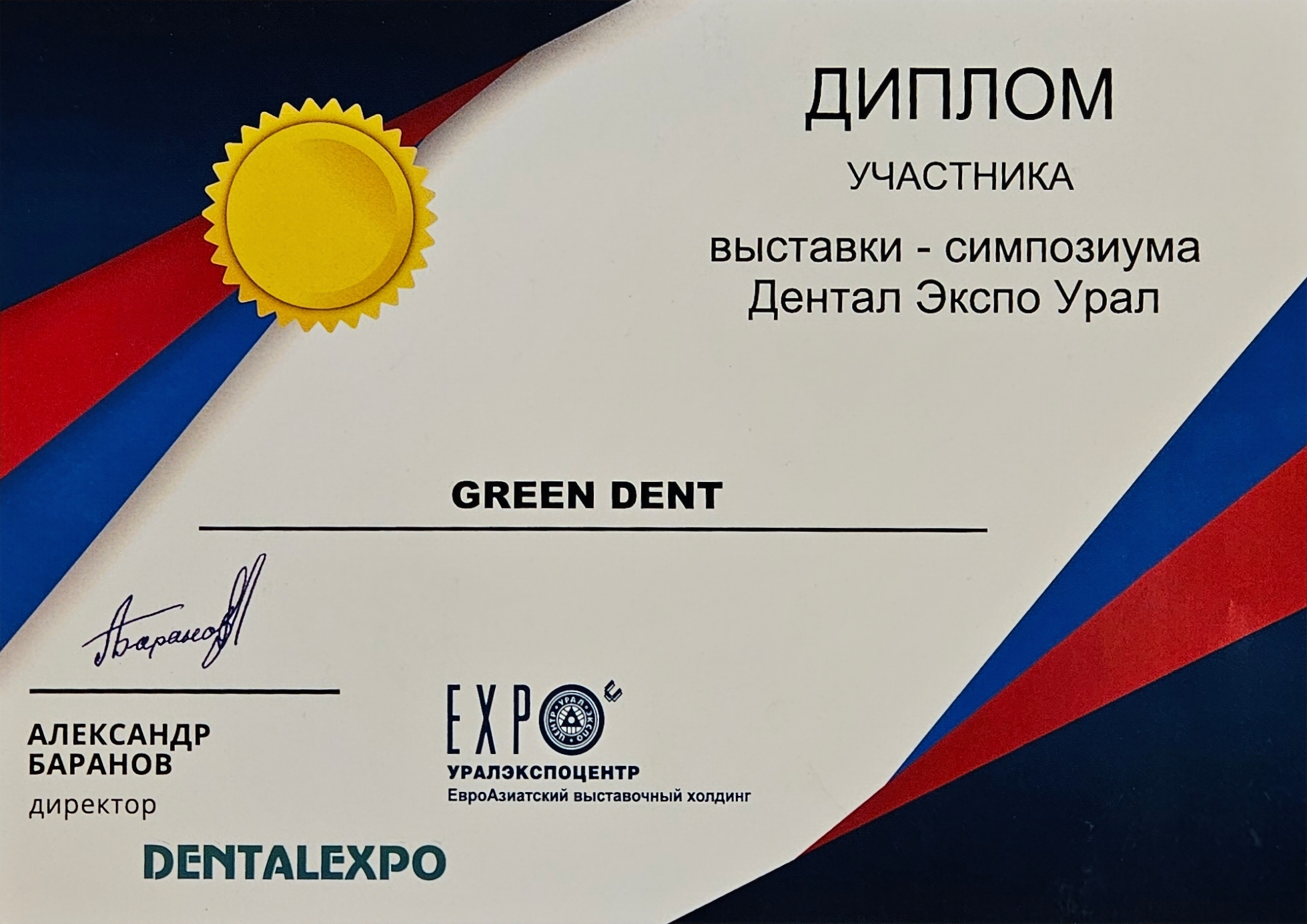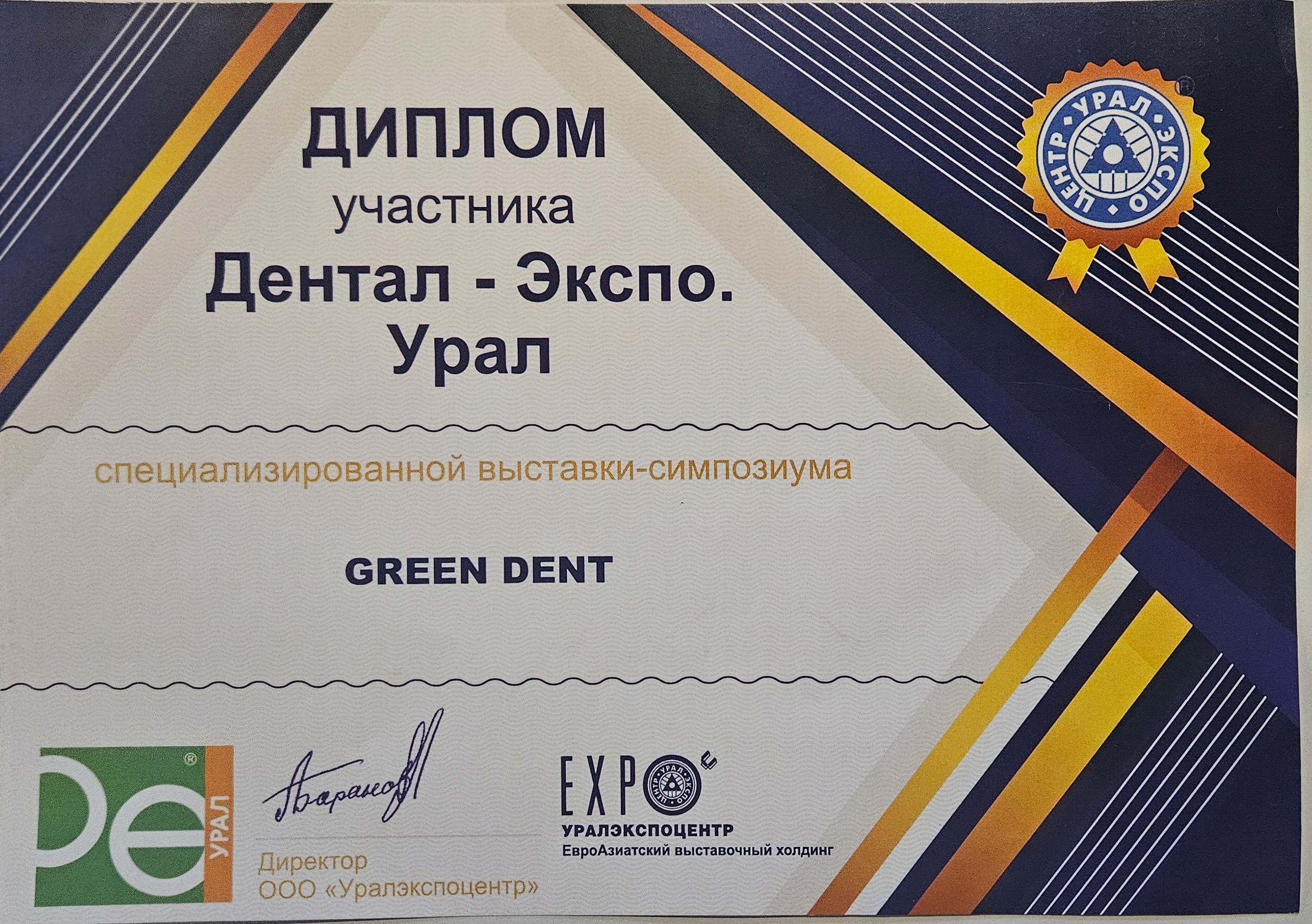 Диплом GREEN DENT за активное участие в «Сибирском стоматологическом форуме» и специализированной выставке «Дентал-Экспо Красноярск»