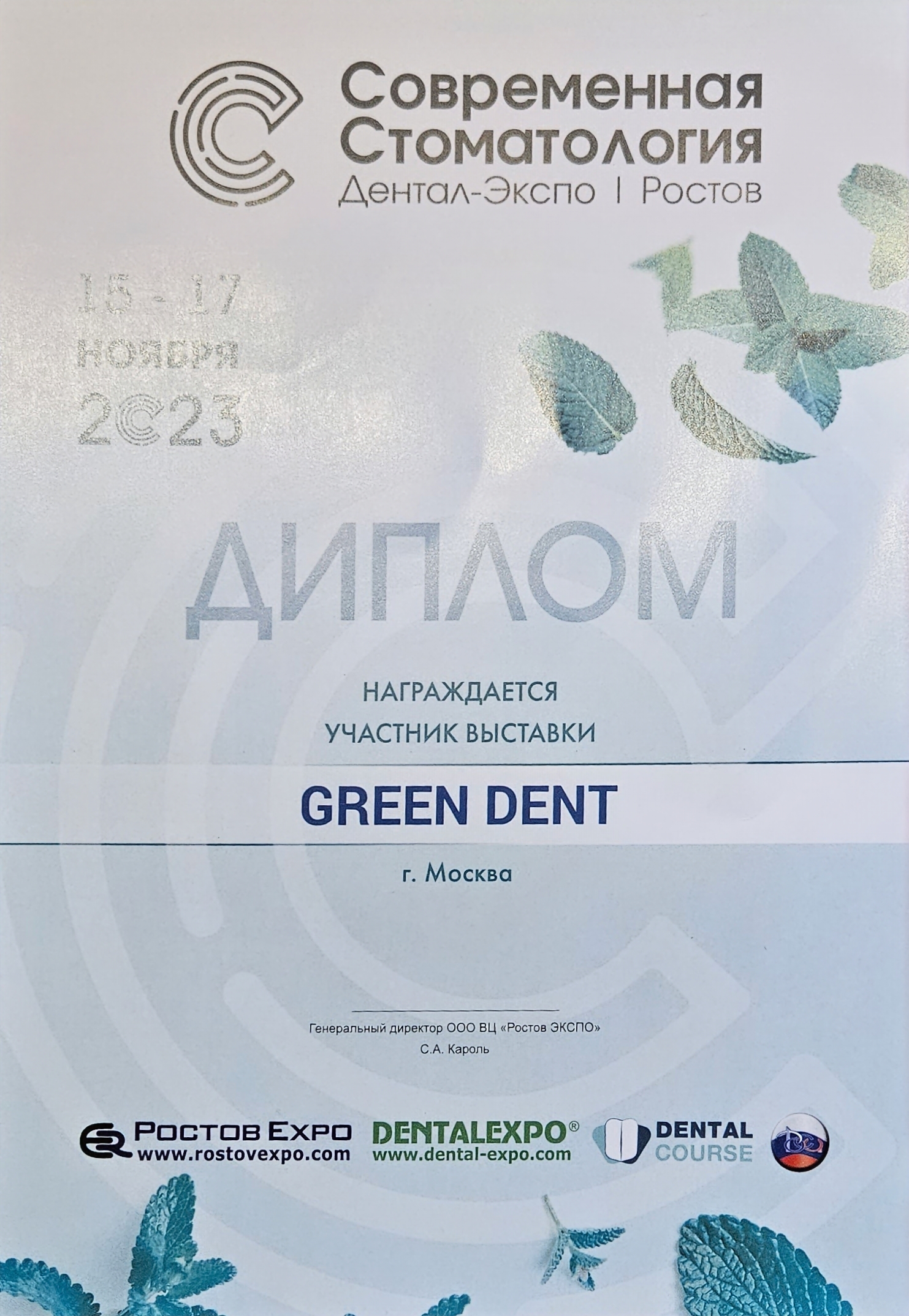 Диплом GREEN DENT за участие в 32-й международной выставке медицинской техники, изделий медицинского назначения и расходных материалов «ЗДРАВООХРАНЕНИЕ-2023»