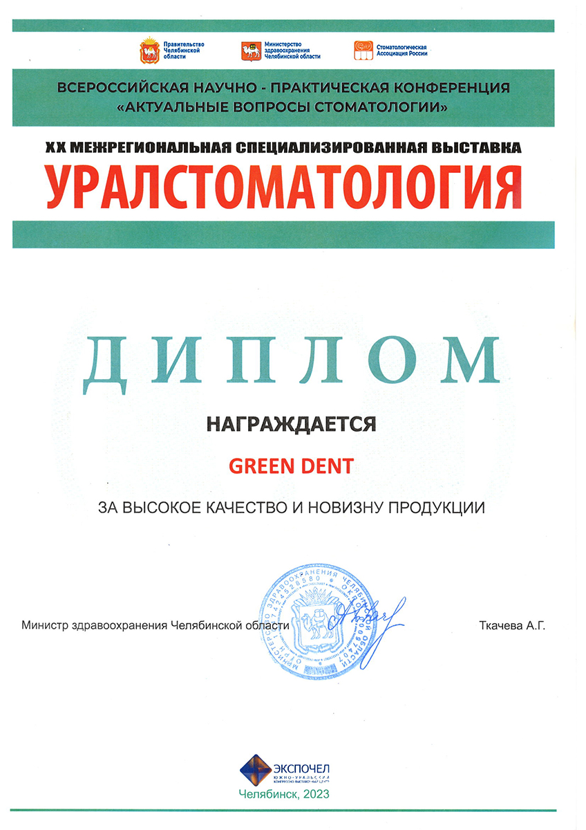 Диплом GREEN DENT за высокое качество и новизну продукции