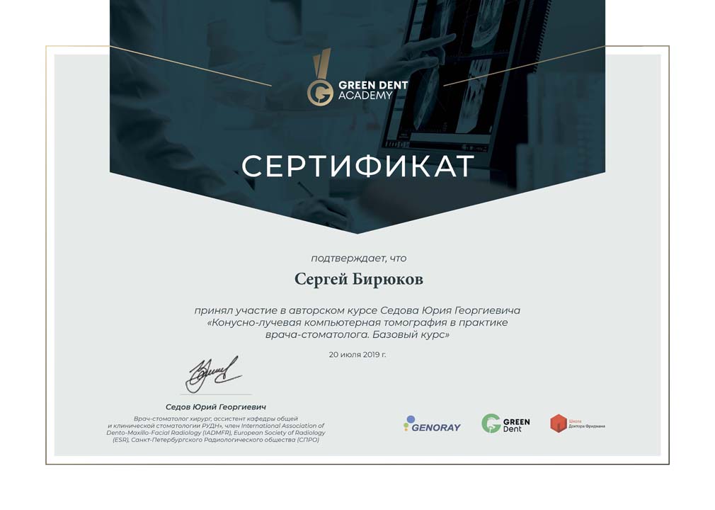 Сертификат подтверждает, что Сергей Бирюков принял участие в авторском курсе Седова Юрия Георгиевича «Конусно-лучевая компьютерная томография в практике врача-стоматолога. Базовый курс»